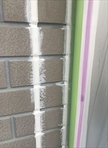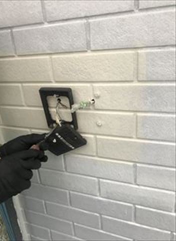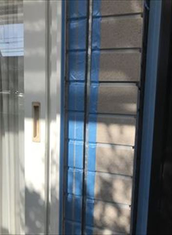 上部の白く横にシール済の箇所はサイデイングボードのあいじゃくり部分(ジョイント部)になります。かなり隙間が目立っていましたのでこの部分もシールいたしました。またこれほどの隙間ですとシールしない場合、塗装後はより隙間が目立ってしまいます。また、コードが飛び出ていますが、玄関照明灯を外して塗装するためです。照明器具を交換する時期に未塗装部分を露出させない為、ひと手間加えてます。