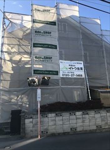 塩尻市広丘で外壁に高耐久塗料フッ素樹脂塗料を塗装しています。今回は軒裏以外、破風、樋、屋根、外壁等すべてフッ素樹脂塗装の施工なのでメイクUPショップ(旭硝子の認定施工店、ルミステージフッ素樹脂塗料取り扱い店)のたれ幕を足場にかけさせて頂きました。