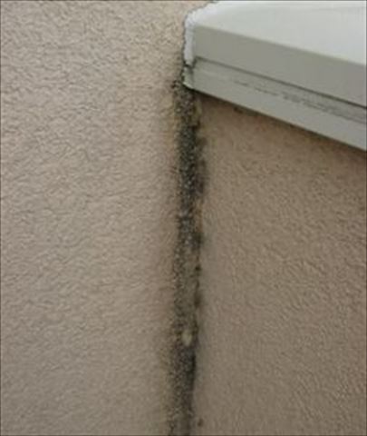 右の写真はお風呂場の窓下です。お風呂からの結露水が流れているため、ほかのところよりも濃くかびや藻が発生しています。