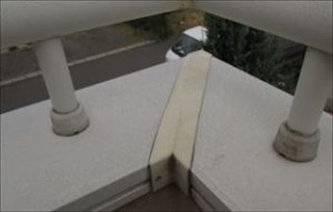ベランダはさらに被害が大きく、カビ、苔、藻が発生しています。笠木という左の写真の白い金属部分、手すりがついているベランダの壁の上場から水が入りカビなどが発生したものと思われます。