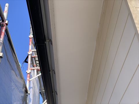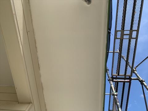 軒天の状態が良ければ通常は1回ないし2回の塗装で済むのですが、このお家の軒天は旧塗膜が剥がれていて、このままでは塗り替えできないので、旧塗膜を全部除去して下塗りをしたあと、軒天用塗料を2回塗りました。