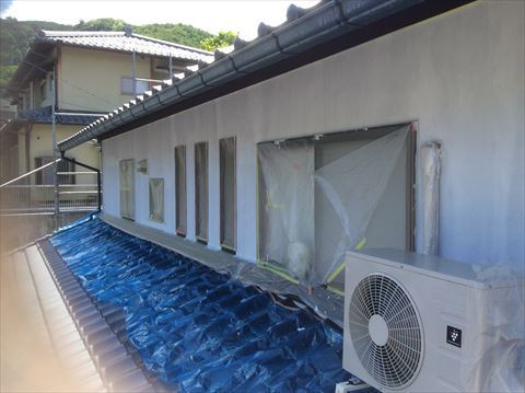 外壁はモルタルづくり、柱や梁、軒天と木部の多い造りです。モルタルは大小クラックがたくさん入っていて、これを補修した後、下塗り、中塗りと工程を進めました。