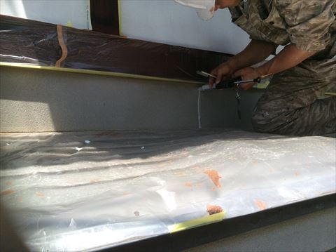 このようなクラック(ヒビ)がたくさん入っていました。モルタルづくりでは仕方がないものです。すぐに雨が入って不具合が生じるということはなさそうですが、このままにしてもあまり気持ちのいいものではないので、まずはこのクラックの補修を行います。以前はこのままではクラックに補修材が入らなかったので、VカットやUカットと言って、わざとクラックを広げ補修材を注入していました。
