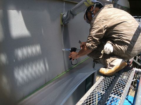 松本市外壁の塗り替え工事|クラック補修後の下塗り・中塗りの工程