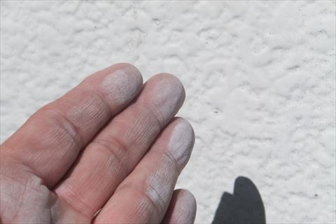 チョーキングのチェックです。塗料の中の色の成分である顔料が紫外線の影響で壊され、粉状に浮いてきて触るとこのように汚れが付く現象です。このチョーキングが出ると外壁のメンテナンスのサインです。早期であれば塗装で済みますが、長い間放っておくと塗装では済まないことになります。