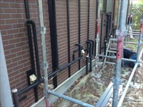 まずは下地づくりです。今回採用したKMEW(ケーミュー)の金属サイディング【はる一番】の施工標準では木製の角材を下地にするとなっていますが、木材では腐食に心配があるので、弊社では樹脂製の角材を使用します。これを450mm間隔で垂直を見ながら壁に打ち付けていきます。サイディング本体はこの角材(胴縁)に取り付けていきます。