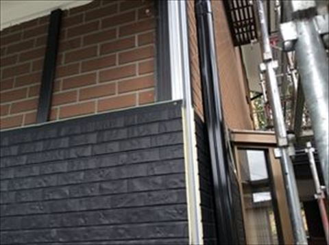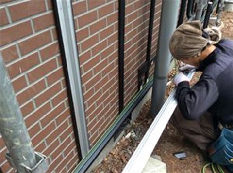 途中窓や配管などの障害物があるとそこを切り欠いて張ります。正確に寸法を取って線を引き、そこを切り欠きます。写真は弊社の若手のホープ小澤君が試行錯誤して切り欠きを行っているところです。こうしてだんだん外壁がきれいに生まれ変わっていきます。日々きれいに変わっていく外壁をお施主様家族は楽しみにしています。