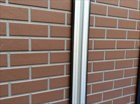 銀色の部材はジョイナーベースです。サイディング板のジョイント部分に取り付け、本体はベースを挟むように張り、最後にジョイントカバーを取り付けます。窯業系サイディングではここは目地となって、シーリングを打ちます。このシーリングが窯業系サイディングの劣化要因の一つなのですが、金属サイディングは目地はなくジョイントカバーで防水します。ジョイントカバーにはパッキンがついているので水の侵入はありません。