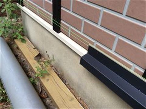 下地工事の一つ、土台水切りとスターターの取り付けです。水平を取って取り付けていきます。ここで1mmでもずれると、だんだんずれが大きくなって、5m以上上の軒天まで行くと大きなずれとなって隙間ができてしまいます。