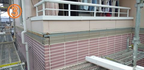 現在ではこのような施工はしていません。この場所には先ほど紹介した水切りというものが取付られているのが本来の姿です。ここはベランダの壁なので水切りはないですが他の外壁には全部取り付いていますので大丈夫です。
