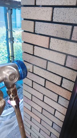 こちらはモルタル部分の吹き付け塗装です。使用した塗料はコーテック株式会社のC-1グラス SR1000という塗料です。フッ素以上の耐久性が期待でき、塗装対象物を選ばないという優れた塗料で、簡単に言うと塗装面をガラスコーティングする塗料です。クリアなのでレンガ調などデザイン性の高い外壁でその風合いを残したいという方にはぴったりの塗料です。多少値段が高いのですがその分長持ちするのでコストパフォーマンスも悪くはないと思います。このC1グラスをエアガンで吹き付けていきます。クリア塗装は刷毛やローラーだと塗り筋が出てしまうので吹き付け塗装を採用しました。