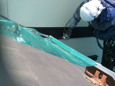 レンガ部分の吹き付けの様子です。このようなデザイン性の高いの外壁にはうってつけの塗料です。ただ、欠点が一つ、全くのクリアなのでザラザラした外壁面では塗った感があまりわからないです。光の加減だったりC1グラスを塗っていない部分があるとなんとなくわかるのですが、ザラザラした面はほとんどわかりません。