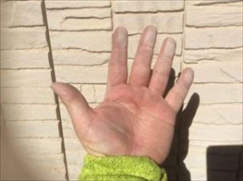 では、ラジカルとは何か・・・簡単に言うと塗膜劣化原因物質です。酸化チタンに紫外線が当たり発生したラジカルは樹脂成分や有機顔料にダメージを与え劣化を促進します。このダメージによっておこるのがチョーキング現象です。上の写真のように外壁に触ると白い粉状の汚れが付く、これがチョーキング現象です。チョーキングは劣化の初期症状で、塗り替え時期のサインです。チョーキングが発生すると徐々に防水性が失われたり、色あせが出たり、ツヤが無くなる、汚れやすくなるといった劣化症状につながります。これらにラジカルが影響しています。