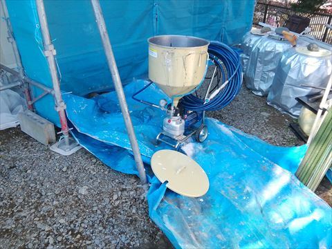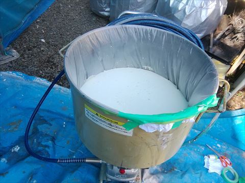使った塗料は水性なので、5%の水を入れて機械でよく攪拌します。攪拌した塗料を機械のタンクに入れて準備OKです。