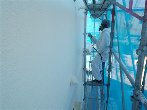 茅野市外壁塗装|鉄筋コンクリート外壁にエアレススプレーで吹き付け塗装