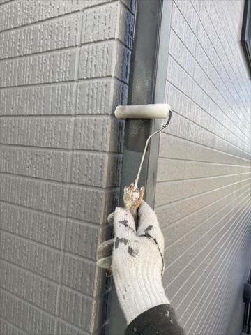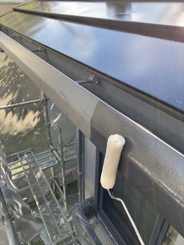 塩尻市のミサワホームの外壁塗装で、こちらは竪樋と横樋の塗装になります。竪樋は塩ビ材、横樋は塩ビ被膜が施されているため、「ビニタイトプライマー」を使用しました。塩化ビニル樹脂を被膜した鋼板は、可塑剤が多く含まれているため、塗り替え後に可塑剤が塗膜表層に移行し、塗膜汚染や塗膜剥離を生じるなどの問題点がありました。ビニタイト工法はこのような問題を解決した専用の改修工法です。