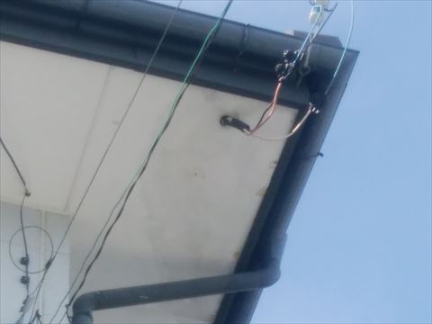東筑摩郡朝日村西洗馬にお住いの方から屋根、外壁の調査依頼がありました。当日は大変風が強かったために二連梯子で屋根に上るのは危険と判断しました。前情報では築25年の屋根材はモニュエル瓦と伺っていたのですが、離れて屋根を目視しましたところ非常にピカピカしておりましたのでモニュエル瓦ではなく平瓦と判断いたしました。モニュエル瓦はコンクリートなので25年もたてば塗装が必要ですが、平瓦であれば塗装は必要ありません。流石平瓦というところで25年経過してもピカピカとツヤが出ていました。ご主人にその旨をお伝えいたしました。屋根上は良かったのですが軒裏のケイカルボードに水染みが出ておりました。ご主人にお伺いしましたところ、5年前にバルコニーの下の軒裏はバルコニーの床から雨漏りをしてボロボロになってしまって軒天交換工事をなさったそうです。角の部分は水染みは出てるがあまり傷んでなかったので交換しなかったそうです。5年前からこの状態を維持しているなら良しとしましょう。しかし右の写真の電線引き込みのある軒裏はお気づきになっていらっしゃらなかったそうです。もし外壁塗装を行うのであればその時に交換ですね。