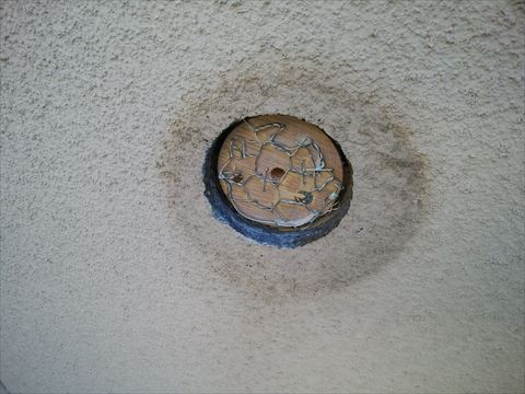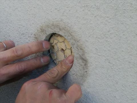 先ずは排管を引っこ抜いてモルタルを塗る下地を作ります。モルタルは10㎜厚の木板(コンパネ)に金属網(ラス網)が貼ってあり、その金属網にモルタルが引っかかるように左官してあります。補修の仕方ですが、空いた穴の裏に適当な木材を穴に入れコンパネの木口から斜めにビスを打ち込み適当な木材を固定します。固定した木材に丸く切ったコンパネを正面からビスで固定します。