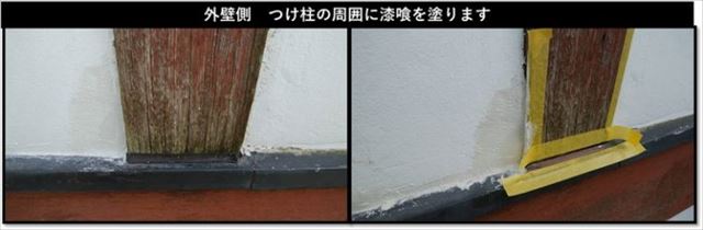 つけ柱に空いていた穴も漆喰で埋めました。切れていたコーキングも打ち直して工事終了です。これで雨漏りの心配も解消されたと思います。