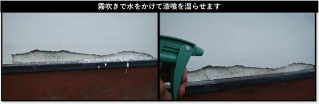 まず霧吹きで水をかけ、漆喰を湿らせます。新しい漆喰と古い漆喰の接着をよくするために、古い漆喰を一度粘土状に戻すイメージです。