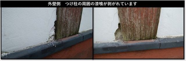 つけ柱周辺の漆喰も剥がれて穴が開いていました。つけ柱とは外壁側に露出している柱のことです。水が入った可能性が高いのはコチラではないでしょうか。つけ柱と外壁の取り合いの部分のコーキングも切れていました。
