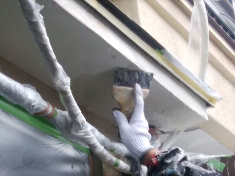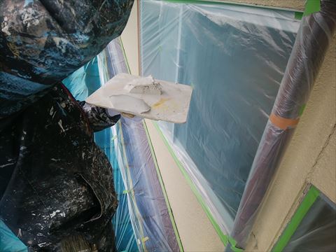 こちらが建築された頃のお家は、モルタルの上に漆喰を塗り上げる工法がよく見られます。モルタルは簡単に言うと洋風漆喰です。ですが漆喰は防水性があるのに対して、モルタルは防水性がありません。なので、モルタルを防水するために漆喰でしあげているんですね。しかし今回は漆喰にさらに防水性を高める塗料、関西ペイント『アレスシックイ』を塗装しますので、補修材は『ALC補修セメント』を使用しました。漆喰よりも粘着力があり左官作業で形がつくりやすいので、モルタル補修にはこれが一番です。