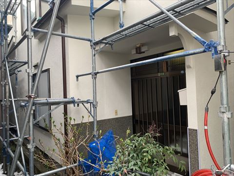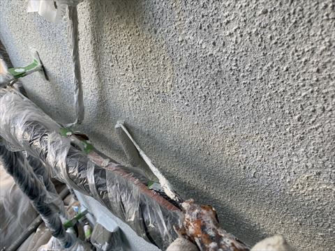 松本市で行いました外壁塗装の様子をご紹介いたします。こちらのお宅は築30年のモルタル外壁にリシンという砂粒を吹き付けた塗装で仕上がっておりました。リシン吹き付け塗装は当時はごく一般的で、モルタル外壁にはほとんどこのリシンが吹き付けられています。リシン吹き付け塗装は、砂粒の吹き付ける量が多い少ないの色々ありましてやはり砂粒の量が多いほど長持ちしているように見受けられます。こちらのお宅はリシンの吹き付けられた量が多かったのか劣化があまり見受けられませんでした。