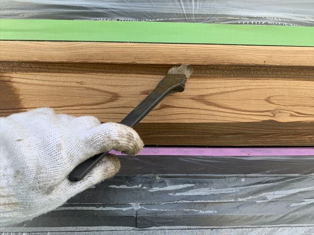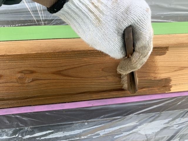 塩尻市|木材の部分を木部保護塗料ガードラックで刷毛塗り