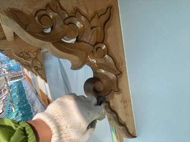 腕木に模様が入っているのでその部分の溝から塗装をしていきます。今回壁は塗装しないので、壁に塗料が飛ばないように塗装していきます。