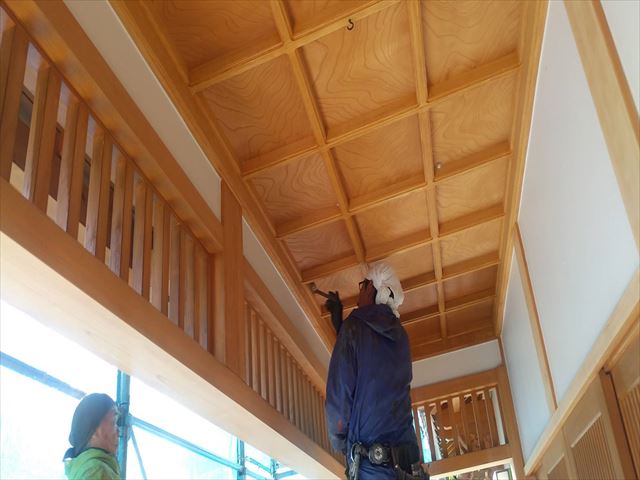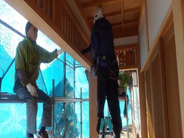 塩尻市大門のお宅での木部塗装も、いよいよ最終段階です。約1ヵ月前から始まり、洗浄に幾日、ケレンに幾日、養生して。。。。とても大きなまるでお城の様なお宅の最終段階。。。。果たしてこの先このような施工現場に出会えるでしょうか。間違いなく記憶に残る現場です。