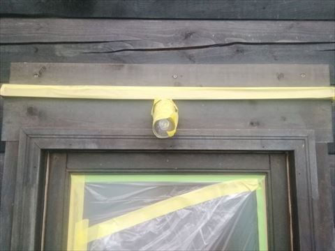 まずはおなじみ、外壁塗装の前には必ず行う養生作業です。窓や給湯器、ガスボンベなど塗料がついてはいけないところをビニールなどで覆う作業です。塗装が終わると剥がしてしまい、後には残らないものですが、養生の出来具合で仕上がりの良し悪しが決まると言っても過言ではない大切な作業です。