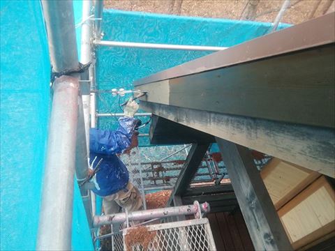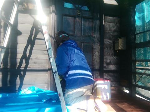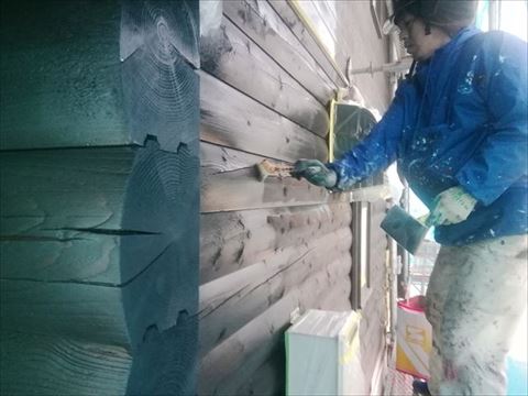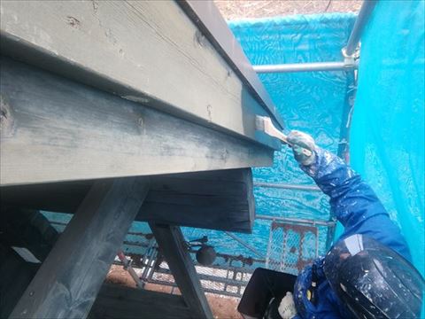 養生をして、補修塗装も終わったのでいよいよ本番、ノンロットのクリーンクリアを塗っていきます。基材の木にしみこませて保護する塗料なので、染み込まなくなるまでたっぷり塗ります。2回塗りの工程ですがモルタルやサイディングの外壁塗装よりも手間がかかる作業です。