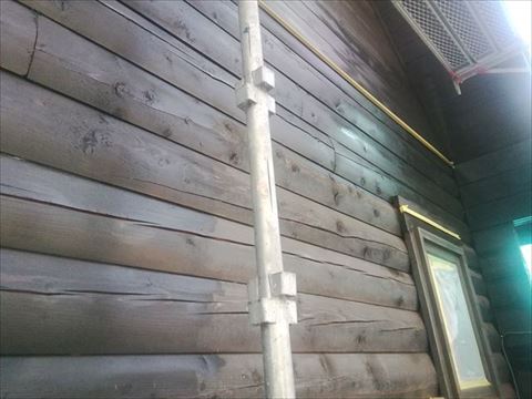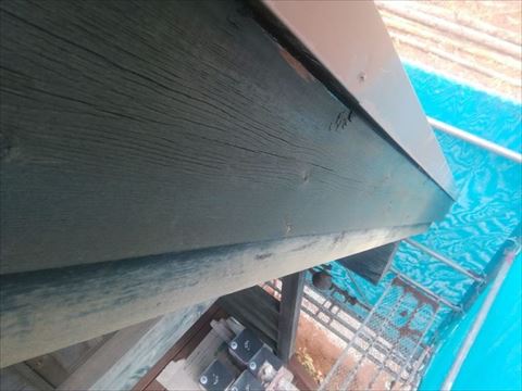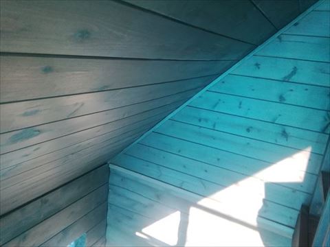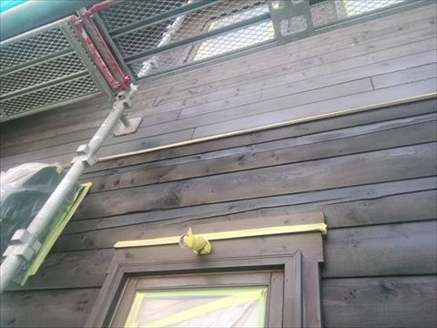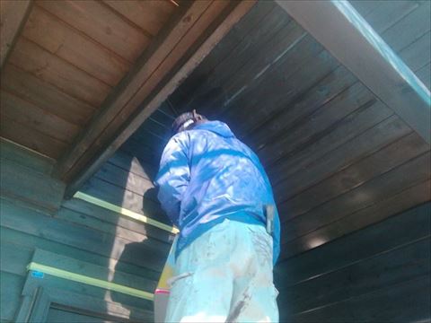 南側の破風板が色あせてしまっていました。前回塗った塗料の残りをお施主様が保管していました。その塗料が使えそうだったので南側の破風だけ塗ります。クリアを塗るので色あせなどがあるとそのまま残ってしまいます。