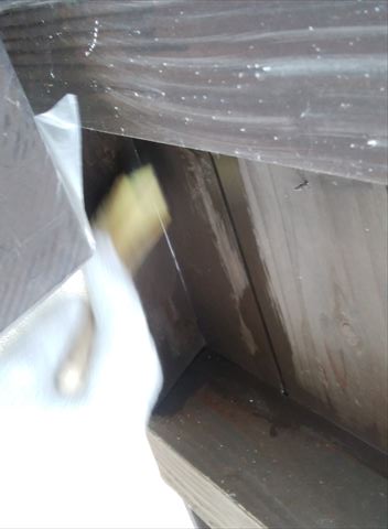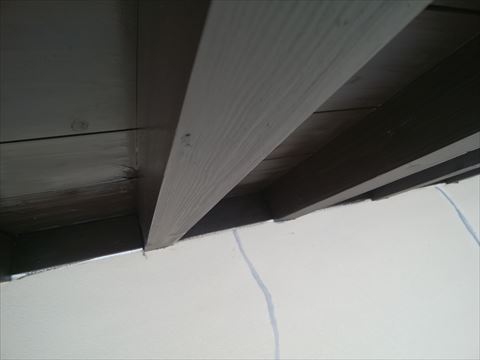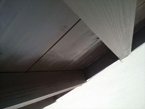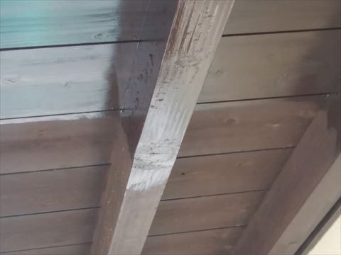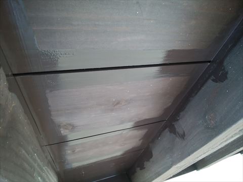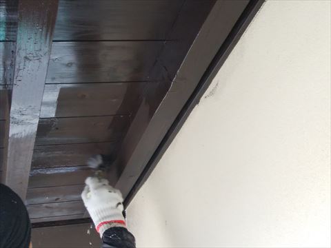 この軒天はウールローラーでは逆に手間がかかりますので、刷毛で塗装致します。ただ塗ればいいものではなく、まず塗装面の隅っこに塗料を塗りこみ、平らな面は後から追いかけます。木部塗装で気を付ける点ですが、ステイン系の浸み込む塗料を使用しますので塗装面のタイムラグがあると塗り斑が出来てしまいます。そうならないように手早く仕上げていく必要があります。