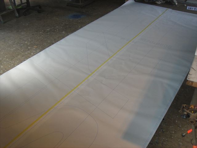 まずは作業場でトレーシングペーパーに下書きをしていきます。看板を各壁面が大きく、それに目いっぱい看板を書くのでトレーシングペーパーもそれに合わせた大きさになります。この下書きがそのまま壁面に写されるので書き損じがないように注意して書きます。何しろこだわりの字体なので・・・