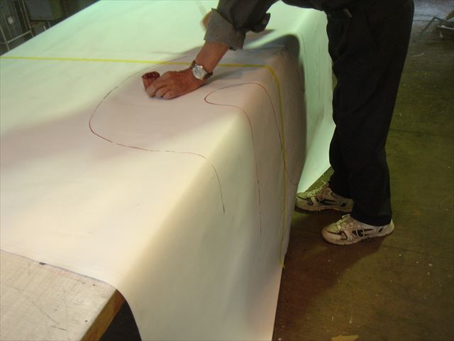 作業所で下書きしたトレーシングペーパーを現場に搬入しました。上から下までは5mを超える高さです。足場を立てることも考えましたが、このトレーシングペーパーを外壁に貼るときに足場だとやりにくいということで、高所作業車をレンタルしてきました。ちょうどいいタイミングで弊社の若手何人かが高所作業車の講習を受けてきたので、練習を兼ねて操作してもらいました。