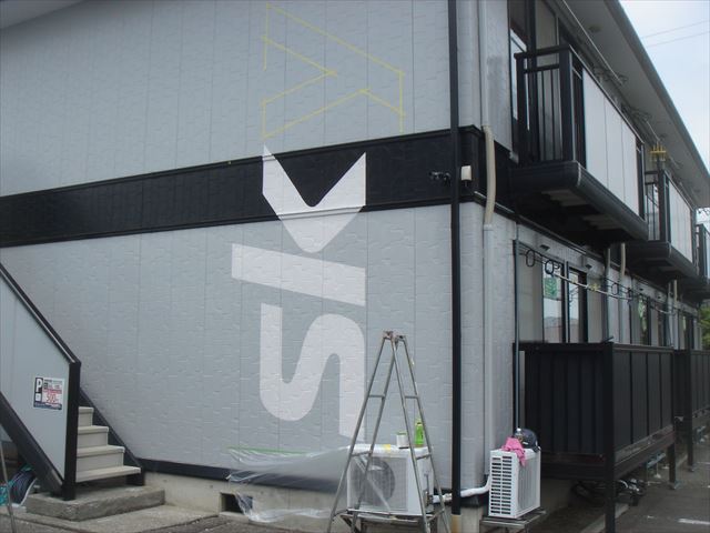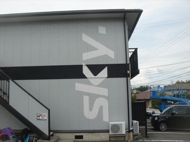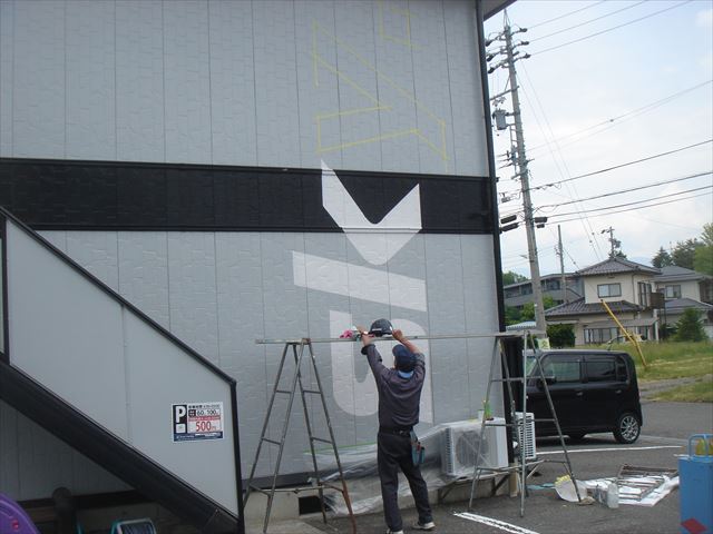 松本市今井のアパートの外壁に、アパート名の看板を塗装する工事を行いました。オーナー様とは以前にご自宅の工事をさせていただいてから親しくさせていただいていて、何棟か持っているアパートの退去時の修繕やエアコンの取り付け、防犯カメラの取り付けなど、いろいろと声をかけていただいています。今回はアパートの入居率アップ策の一つとして、アパートの壁面にアパート名の看板を書いてほしいというご依頼でした。