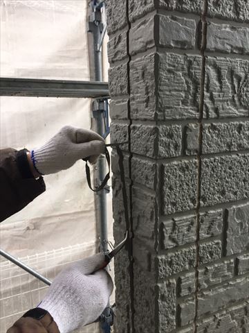 サイディング板間目地に切れ目が入ったら引っ張って古くなったコーキングをはがしていきます