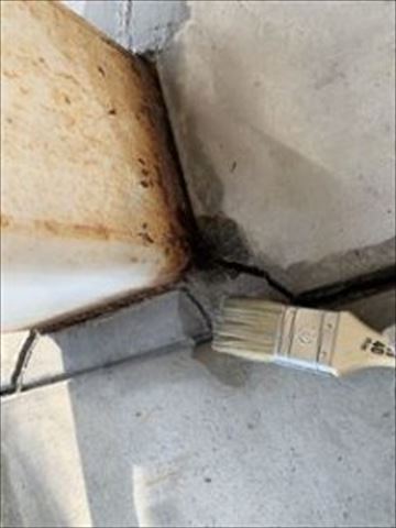 刷毛で塗っているのは『水』です。補修材の水分が下地の急速な吸水や直射日光の影響で短時間で乾いてしまうと、正常な接着硬化が出来ない『ドライアウト』という現象が起きてしまうので、事前に下地に水を散布します。