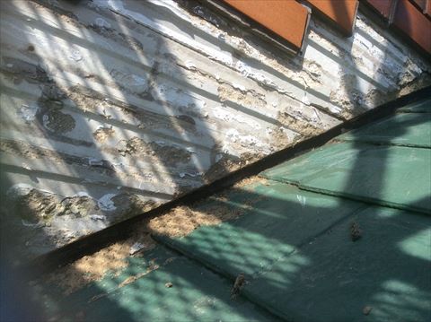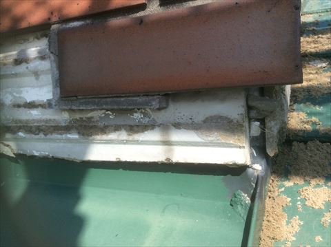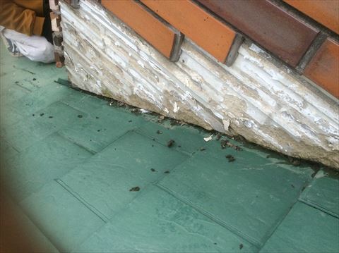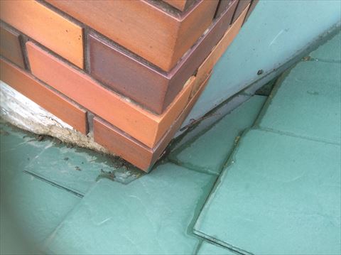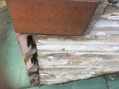 煙突上部にある谷という雨水の通り道が、煙突の角に来ています。水の処理をきちんとしていれば問題なかったのですが、レンガタイルが貼ってある下地にちょくせう水が来て、その処理がされていないため、下地がボロボロになっていました。セメント系の下地なのでこれではタイルの重みを支えることができません。その結果レンガタイルが剥がれ落ちてしまったのです。