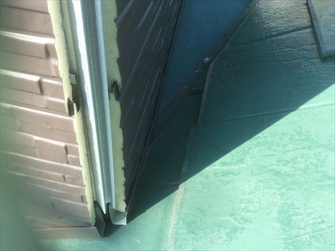 L字のスターターという板金を隙間部分に打ち付けて、屋根材とスターターをシーリング材で密着させます。これで煙突が水に触れることはありません。この後金属サイディング用の樹脂胴縁という下地を打って、金属サイディングを貼っていきます。