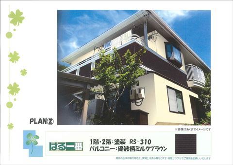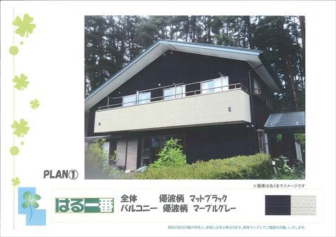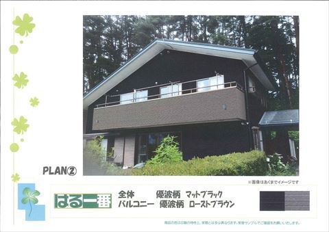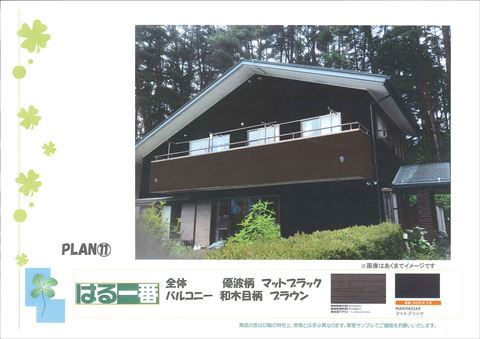 ご要望を伺いつつ、何回か打ち合わせを重ねて、PLAN⑪までお作りして納得いくデザインが出来上がりました。同じ柄で違う色をベランダのアクセントにしてPLANを作ってきましたが、和テイストが欲しいということで、建物本体は優波柄マットブラック、ベランダアクセントは和木目ブラウンという木目調の柄になりました