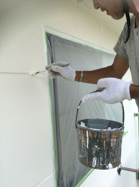 次に下塗りの工程です。塗装は外壁、屋根ともに特別なことが無い限り、基本は下塗り、中塗り、上塗りの3回塗りです。その最初の工程が下塗りです。外壁と塗料を密着させる接着剤の役割と、微細なクラックや割れ、欠け等を補修する役割があります。この家には目地に微細なクラックが入っていたので、それに追従する微弾性塗料を採用しました。弾力性があるので建物や外壁の動きに着いていってくれます。特に目地には刷毛でしっかり塗料が入るように塗っていきました。