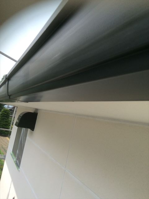 まず破風樋、軒天の塗装を行いました。屋根もフッ素で塗り替えたので、破風樋も屋根と同じAGCのフッ素塗料を使っています。つるつるの平らな面なので、刷毛やローラーの後が目立ってしまいます。なるべく刷毛、ローラー跡を残さないように・・・職人技です。
