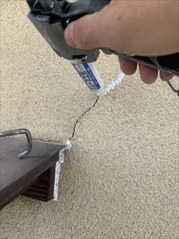 クラックや崩れなど補修しなければならないところがあれば、塗装前に補修します。大きいクラックは写真のハンドスムーサーという道具でエポキシ樹脂系の充填剤を入れます。ヘアクラックという微細なクラックの場合は塗装の下塗りで補修する場合もあります。