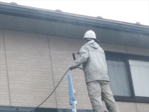 長年かぶってきた砂ぼこりや、苔、藻、鳥の糞などを高圧洗浄機で洗い流します。外壁の劣化が激しい場合、先に洗浄してしまうとそこから水が入ってしまうので、その場合は補修を先にしてから洗浄します。