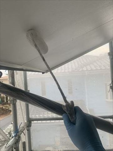 屋根の出の裏側を軒天と言います。意外と汚れている場所です。こちらは透湿性の高い塗料で塗装することが多いです。軒天がきれいになると全体が締まります。