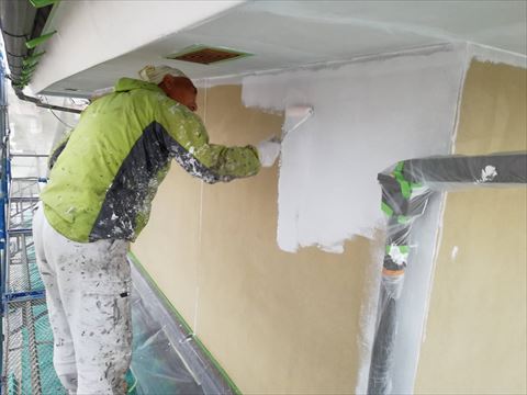 外壁塗装は通常下塗り、中塗り、上塗りの3回塗りです。その一番最初の下塗りの工程です。塗装対象(外壁など)と塗料の密着を高める役割があり、外壁の素材や状態によって下塗り材をシーラー、プライマー、フィラー、サーフェーサーと変えています。何を使うかは我々プロにお任せください。