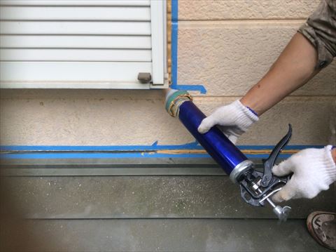 外壁材のボード間の目地や、窓周りにはシーリングというゴム状の充填剤が打たれています。塗膜の劣化とともにこのシーリングも劣化します。防水の目的の建材なので外壁塗装と同時にシーリングの打ち替えもお勧めします。この後塗装する塗料によって、シーリングを先に打つか後に打つか変わります。