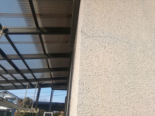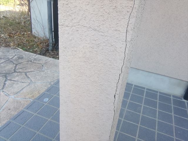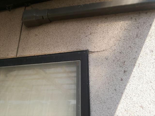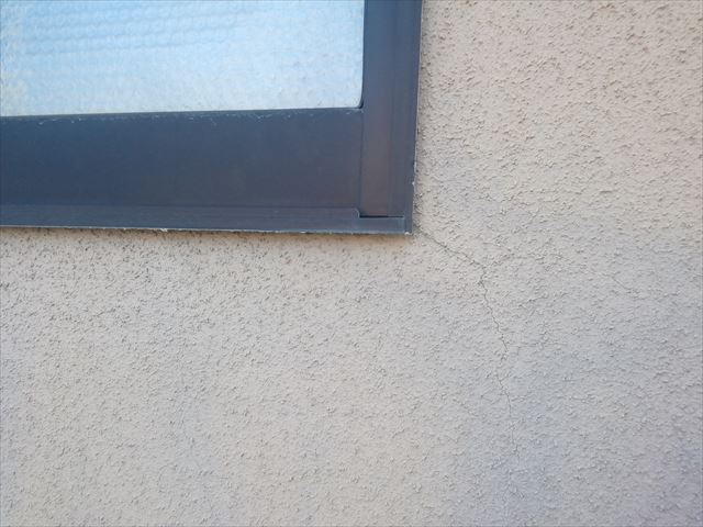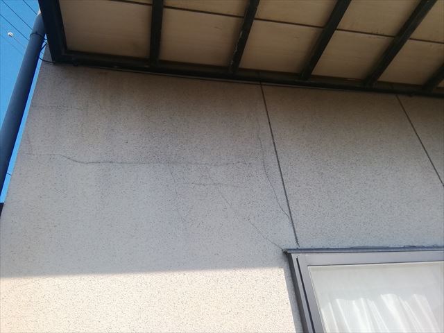 南面のサッシからぐるっと東面に回ってクラックが入っています。こちらも大きなクラックで、シーリングで補修して塗装では一時しのぎの策でしかありません。玄関柱の縦のクラックとこの横のクラック、縦横の揺れが存在する立地なのではないかと思いました。